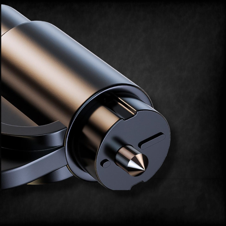 Este llavero es una herramienta de seguridad en carretera, con función de martillo rompecristales y corta cinturón de seguridad, podrás salir rápidamente de tu vehículo en caso de emergencia. Su compacto diseño incluye un resorte con punta de acero que romperá la ventanilla en pequeños trozos, evitando posibles cortes. Además, su cuchilla en ángulo permite cortar fácilmente el cinturón de seguridad retirando el protector de su parte trasera.